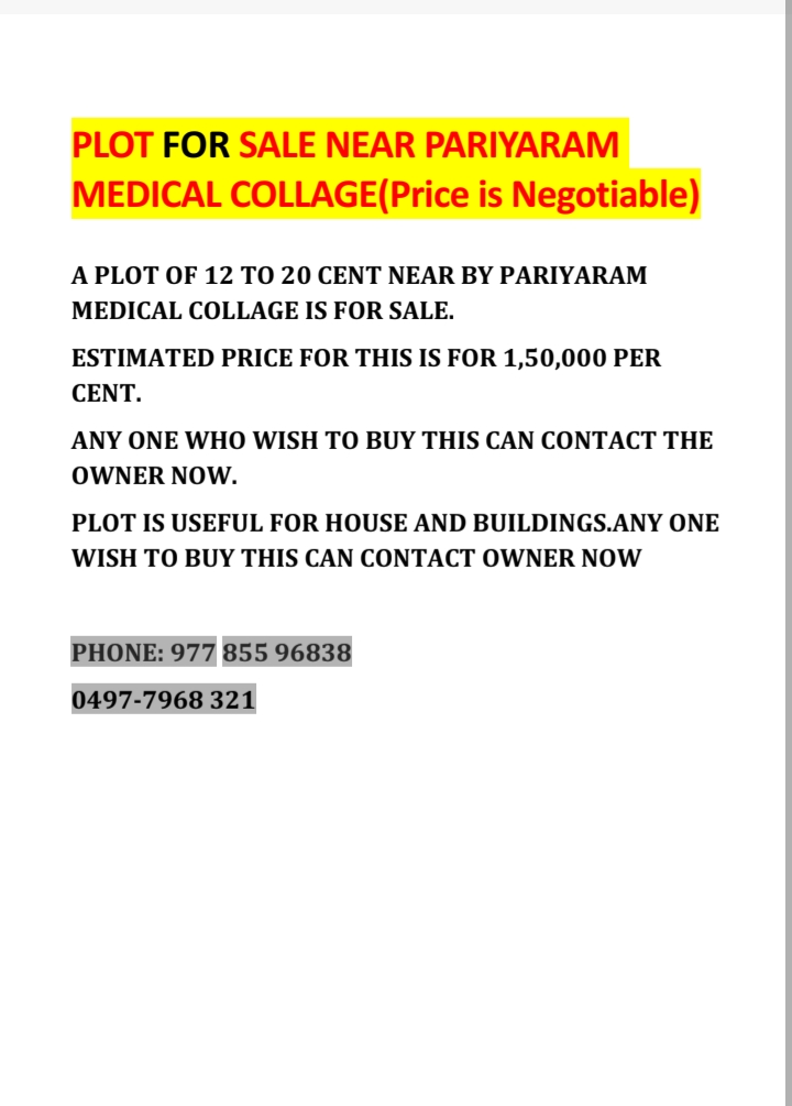 A plot of 15 to 20 cent Near by Pariyaram Medical College,Embate road , kannur is for sale .